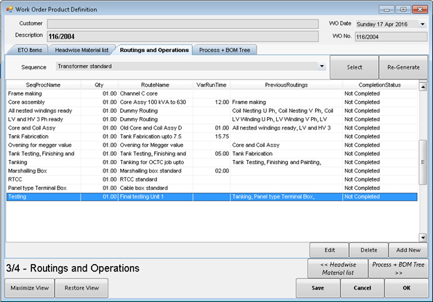 Each routing contains a sequence of operations with operation number, operation name, approved work centers, crew size, setup, run, teardown requirements and other key routing data.